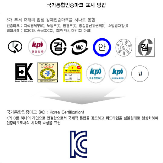 KC는 Korea Certification의 약자로 2009년부터 13개의 법정의무인증마크가 통합된 국가통합인증마크입니다.